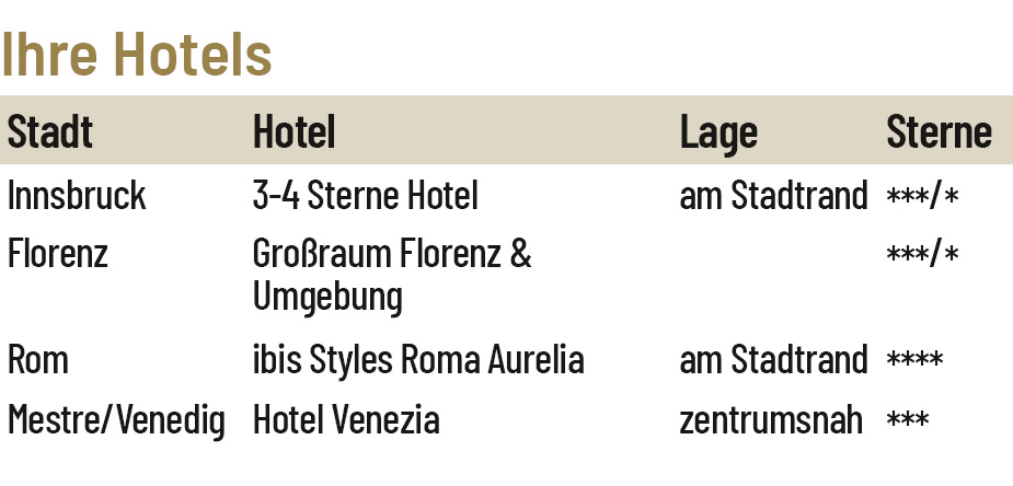 Nachmittags erreichen wir Florenz. Zimmerbezug in Ihrem Hotel. Der Rest des Tages steht Ihnen zur freien Verfügung.