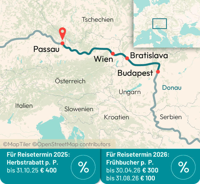 Morgens erreichen wir Passau. Nach einem letzten ausgiebigen Frühstück an Bord, nehmen Sie Abschied von Ihrem Traumschiff. Ausschiffung und Heimreise. Rückankunft am Abend.