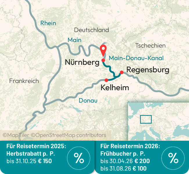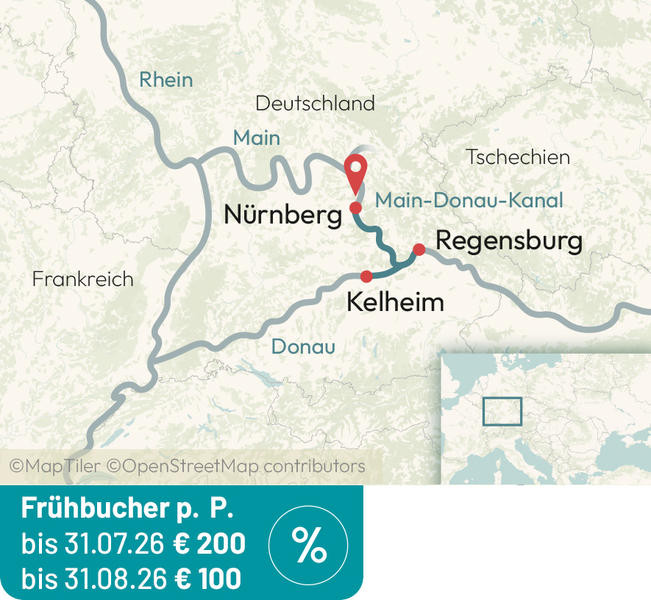 Erleben Sie sechs unvergessliche Tage auf den Flüssen zwischen Nürnberg, Regensburg und Kelheim. Genießen Sie die Zeit an Bord und auf den wunderschönen Weihnachtsmärkten von Regensburg und Kelheim und den weltberühmten Christkindlesmarkt von Nürnberg. Nürnberg – Regensburg – Kelheim – Nürnberg