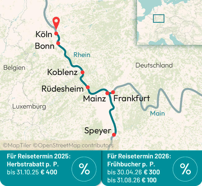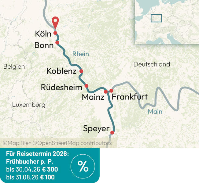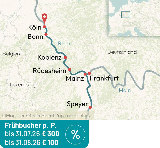Am frühen Morgen erreichen Sie Köln. Ausschiffung und Rücktransfer.