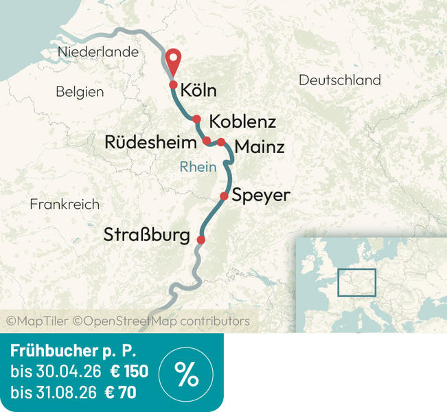 Morgens erreichen wir Köln. Ausschiffung und Rücktransfer zum Zustiegsort.